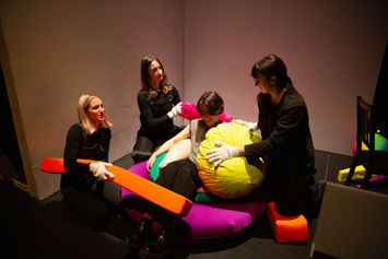 À ce kiosque, des massages-mouvements sont proposés sous forme d'expérience interactive ou autodirigée à l'aide d'un modèle miniature, de grands objets texturés et de guides visuels.