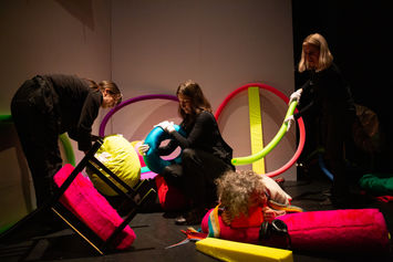 Cette œuvre invite le public à utiliser la lumière, le son et le mouvement pour manipuler une scène à deux interprètes.